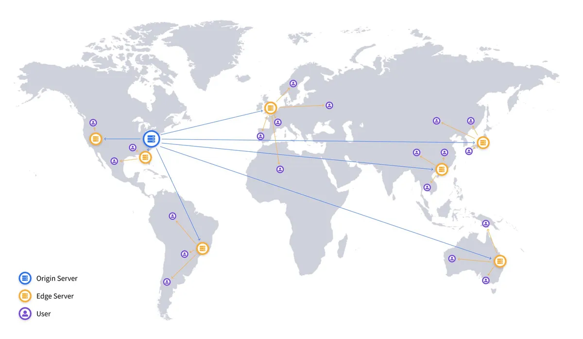 In this image, you can understand what is happening. We only have 1 origin server, but there are several cdn pops. So with a US server and a cdn pop on Brazil, someone from Brazil can access your server from the Brazil pop instead of hitting the origin server at US.